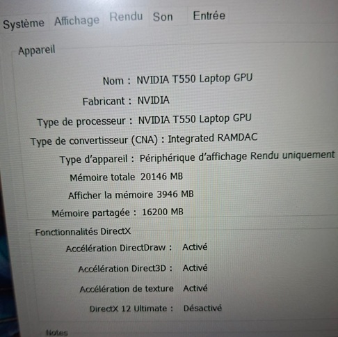 - Carte graphique : NVIDIA T550 4G VRAM + Intel UHD graphique